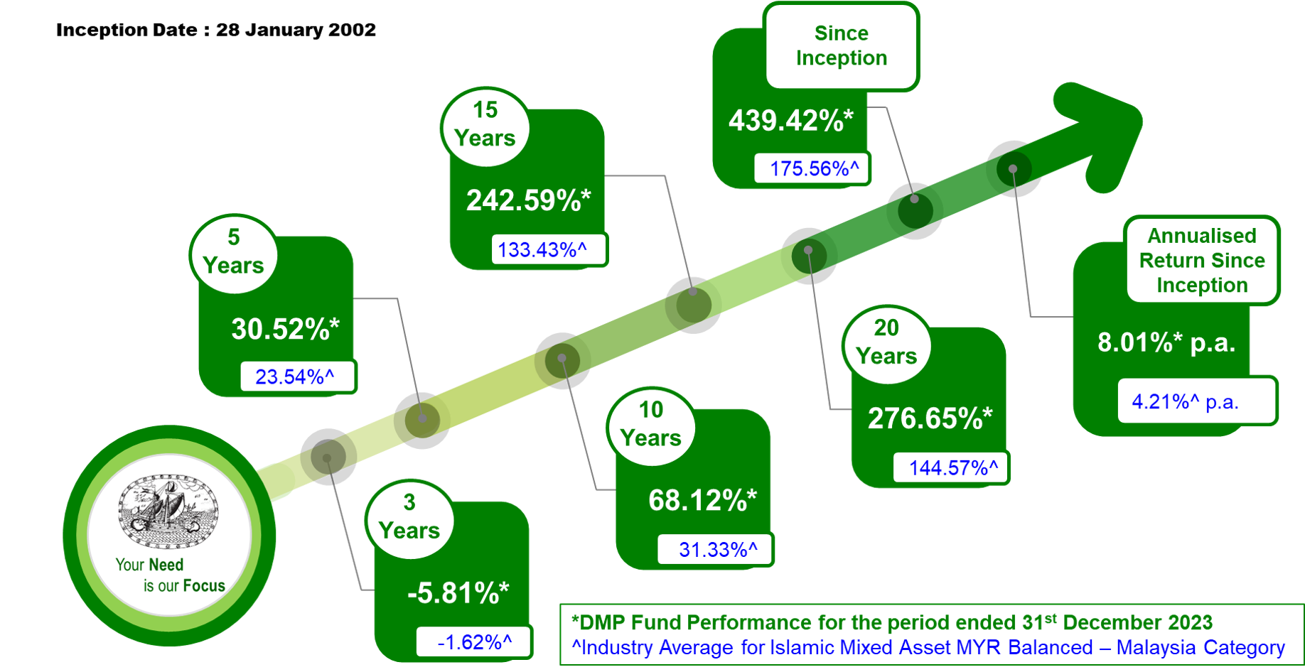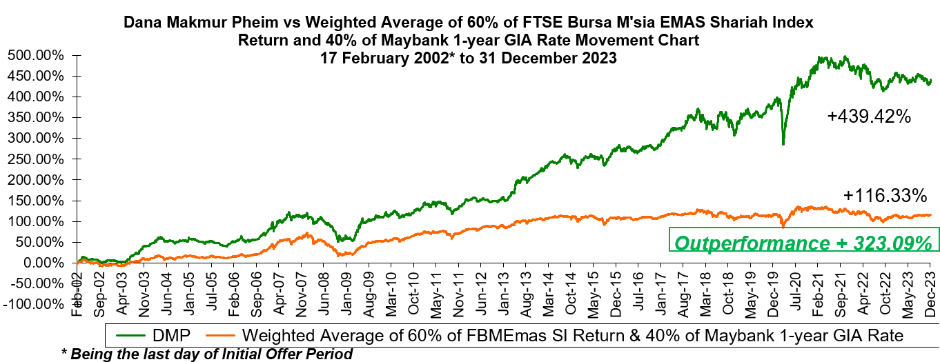 Cumulatively, Dana Makmur Pheim registered a total return of 439.42% for 20 years and 11 months since inception, outperformed the cumulative benchmark return (116.33%) by a big margin of +323.09% as at 31 December 2023. The annualized return since inception was 8.01% p.a. (versus benchmark return of 3.59% p.a.), outperformed by +4.42% as at 31 December 2023. This Islamic balanced fund has a maximum portfolio allocation of 60% in Shariah-Compliant Equities and Shariah-Compliant Equity-Related Securities, and yet was still able to generate such an outstanding performance and track record.