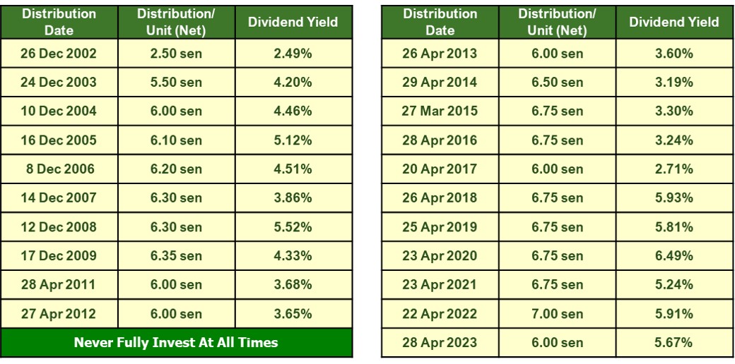 Over its 21 years of operation, Dana Makmur Pheim has consistently produced income distributions every year without fail (thanks to the cash reserves it accumulated via realized profits arising from stock disposals).