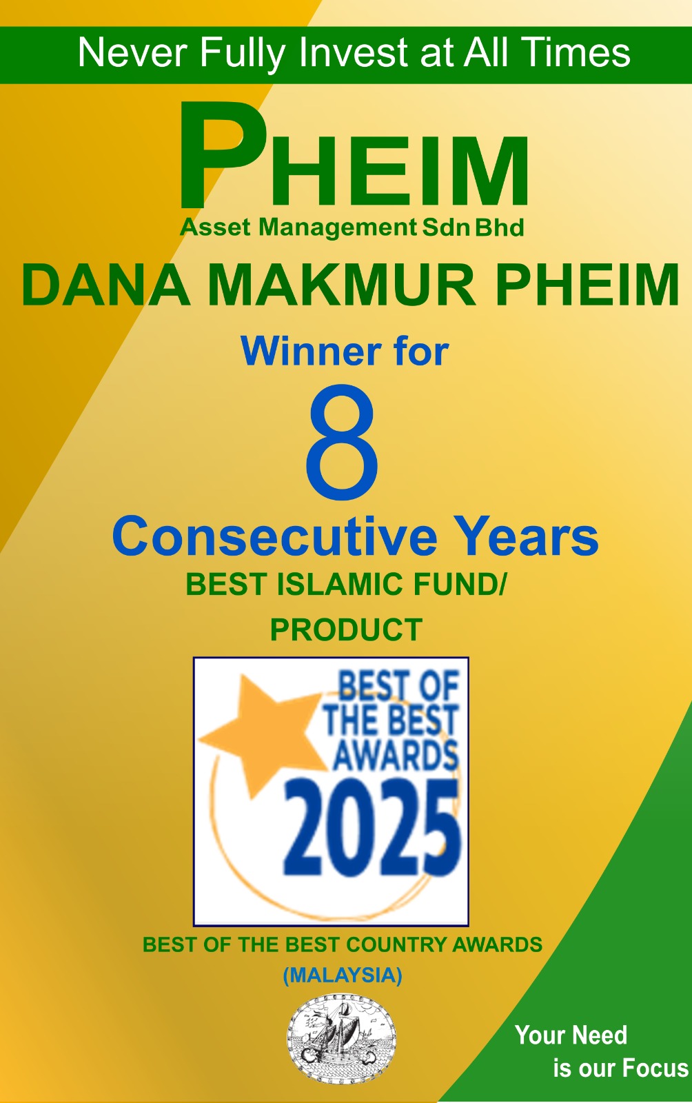 For seven consecutive years, Dana Makmur Pheim was awarded the Best of the Best Country Awards (Malaysia) by Asia Asset Management for the category of “Best Islamic Fund/Product” in 2018 – 2025.