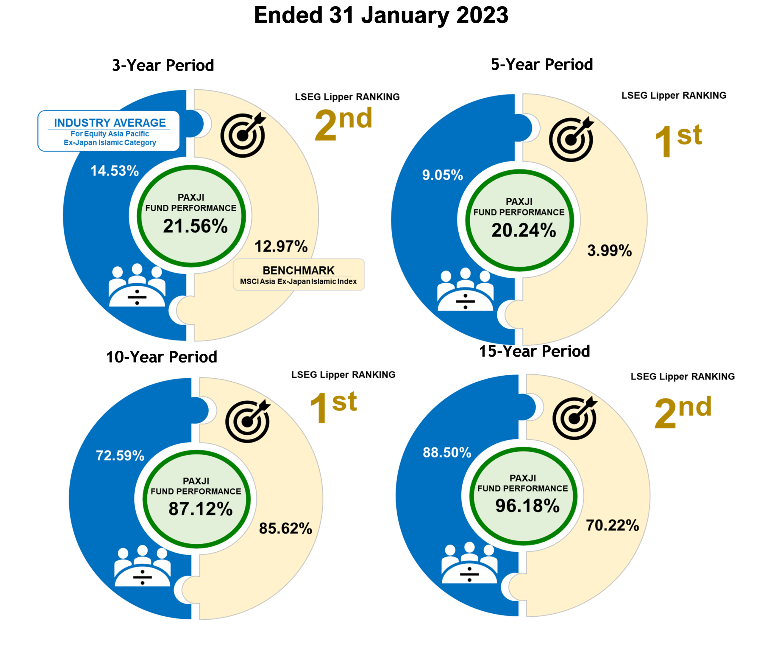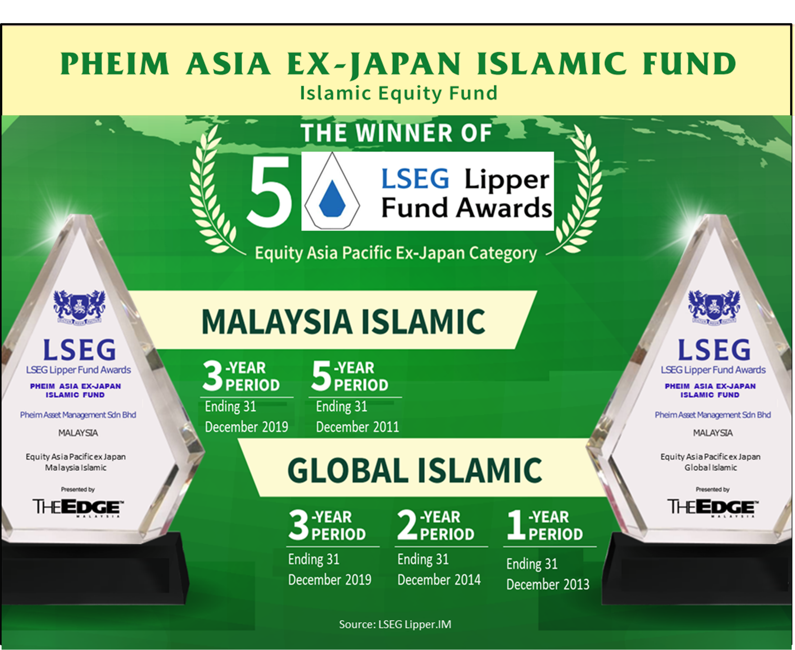 Pheim Asia ex-Japan Islamic Fund has won 3 LSEG Lipper Fund Awards (Global Islamic – Equity Asia Pacific ex-Japan category) for 1-year period ending December 2013; 2-year period ending December 2014; and 3-year period ending December 2019. On the local awards, Pheim Asia ex-Japan Islamic Fund has also won 2 LSEG Lipper Fund Awards (Malaysia Islamic – Equity Asia Pacific ex-Japan category) for 5-year period ending December 2011; and 3-year period ending December 2019.
